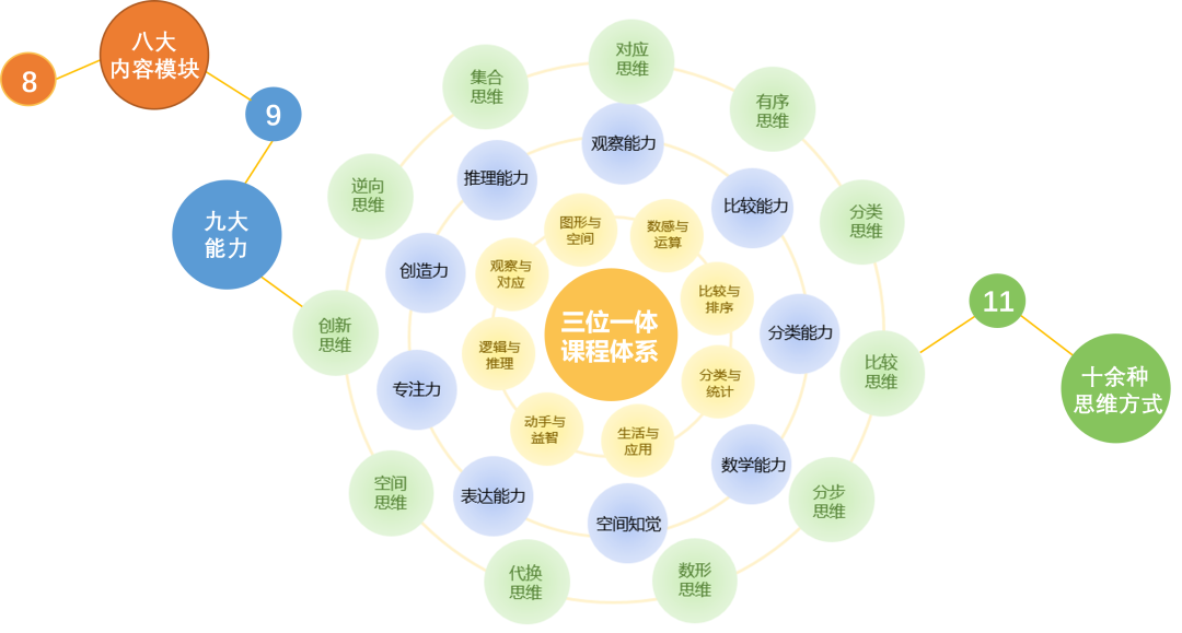 《幼儿园教育指导纲要(试行)》《3-6岁儿童学习与发展指南》中提出要让孩子“从生活和游戏中感受事物的数量关系并体验到数学的重要和有趣”“能发现生活中许多问题都可以用数学的方法解决”,思维加依据指南和纲要的要求,将系统化的数学思维内容融入儿童化、生活化、游戏化的主题情境中,更符合幼儿思维特点,更适合中国幼儿学习。